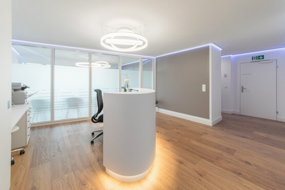 Als wir das Projekt übernahmen, erarbeiteten wir umgehend eine Gesamtplanung mit Elektro- und Sanitärplanung und gaben das Baugesuch ein. Anschliessend setzen wir uns mit der Gestaltung auseinander und kreierten den geschwungenen Empfang als Symbol für die schwangere Frau. Im Weiteren konnten wir Frau Sahili mit unserem Grundriss überzeugen, indem die Glastrennwand vom Empfang zum Warten schräg gestellt ist. Wir kreierten ein Moodboard und erste Visualisierungen, um damit unsere Gestaltungsideen zu präsentieren. Daneben führten wir mit dem Vermieter Verhandlungen für die Kostenübernahmen, die er zugesichert hatte.