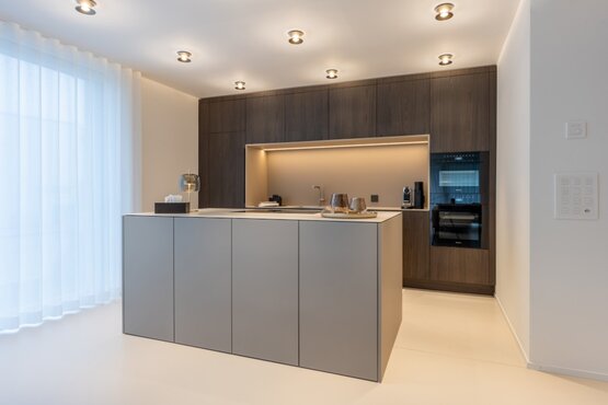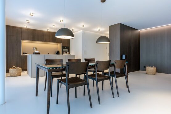 Das Wohnzimmer beeindruckt durch seine minimalistische Gestaltung, die Ruhe und Klarheit ausstrahlt. Die neutrale Farbpalette mit dominierenden Beige- und Brauntönen verleiht dem Raum eine warme, einladende Atmosphäre. Klare Linien der Möbelstücke unterstreichen den modernen Stil. Bequeme Sofas und Sessel bilden eine gemütliche Sitzgruppe um einen eleganten Couchtisch. Eine Kombination aus Ribag Einbau- und Aufbauleuchten sowie stilvollen Pendelleuchten von Flos sorgt für eine ausgewogene Lichtverteilung.