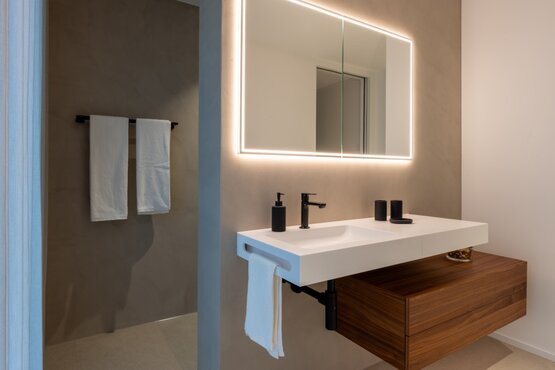 In der heutigen Zeit ist das Badezimmer nicht mehr nur funktional, sondern ein Ort der Entspannung und des Wohlbefindens. Das Herzstück dieses Badezimmers ist das minimalistische Design mit klaren Linien und einer reduzierten Farbpalette. Die Kombination aus weissen Oberflächen und warmen Holzelementen schafft eine harmonische Atmosphäre, die modern und zeitlos wirkt. Ein beleuchteter Spiegel sorgt nicht nur für optimale Lichtverhältnisse, sondern fungiert auch als stilvolles Designelement. Indirekte Beleuchtung verleiht dem Raum Tiefe und schafft eine angenehme Stimmung.