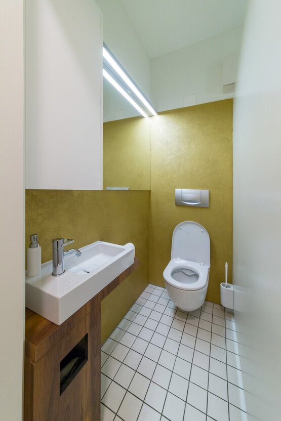 Wir nahmen dieses Goldgelb und setzen es als Kraft des Lichtes kombiniert mit den Naturelementen ein. Im anderen standen wir vor der Herausforderung den unendlichen langen Korridor auf irgendeine weise aufzulösen. Das gelang uns mit den schräggestellten Hochglanz weissen Wandelementen, die wir zusätzlich mit dem Naturelement bespielten. Im Zentrum gestalteten wir den Wartebereich, der durch die überhöhen Sitzlehnen zugleich als Raumtrenner dient. In den Toiletten spachtelten wir die bestehenden keramischen Platten und verwenden dort eine Spezialfarbe, die uns das Goldgelb wiedergeben.